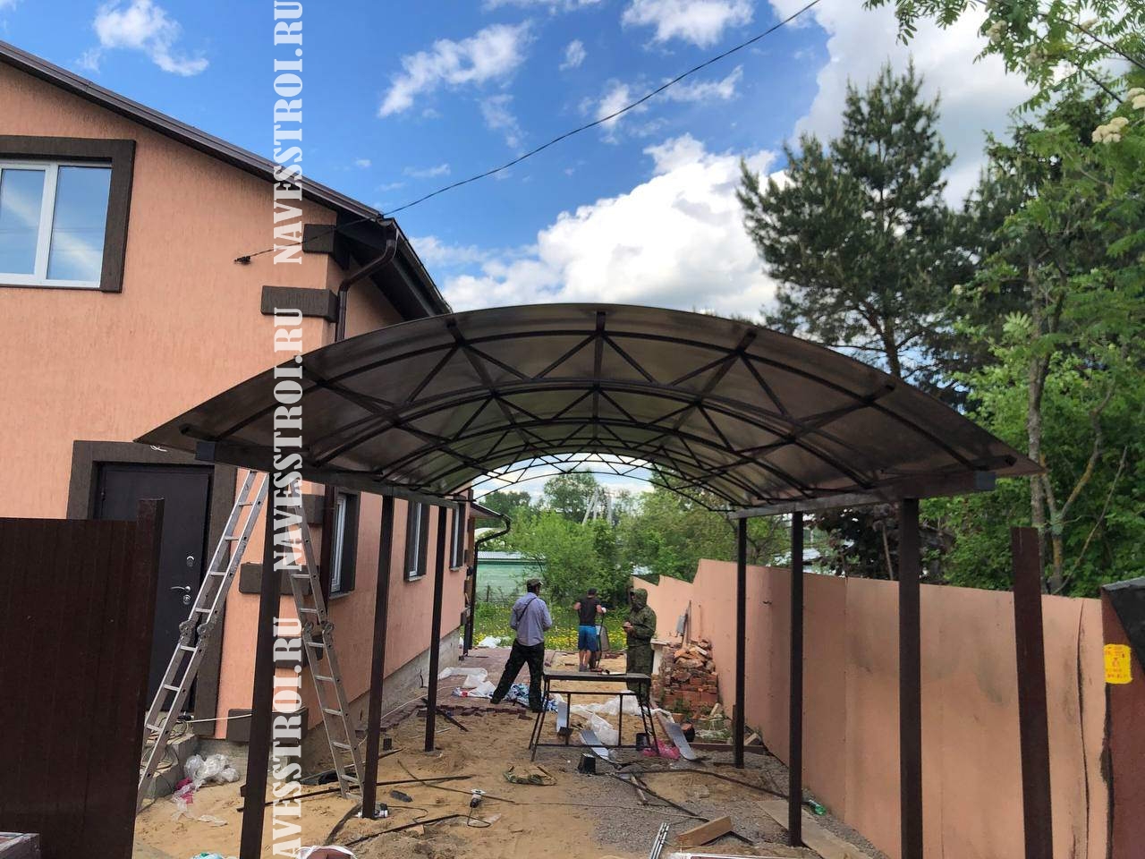 За день на даче изготовили арочный навес 5 на 7 с покрытием поликарбоната. Привезли уже готовые крашенные фермы и весь остальной материал. Все за собой убрали и увезли мусор. Молодцы!