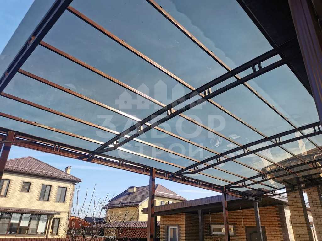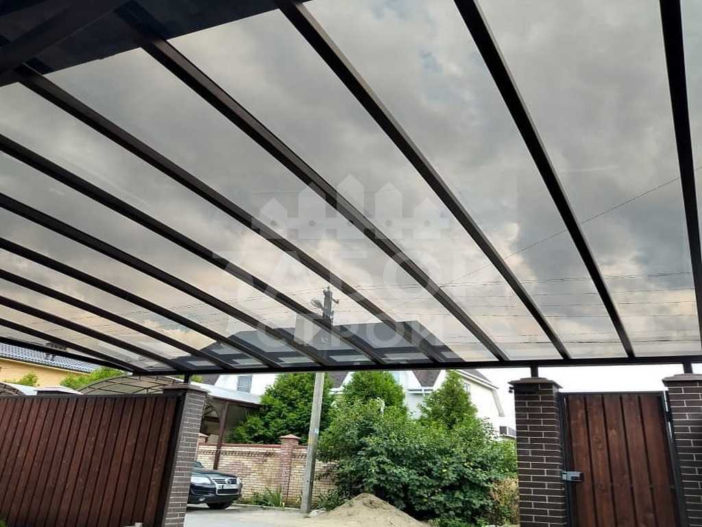 Поэтому компания "Навес Строй" настоятельно рекомендует не экономить, а усилить каркас навеса из монолитного поликарбоната более жёсткими профилями с увеличенной толщиной металла и количеством несущих ферм.